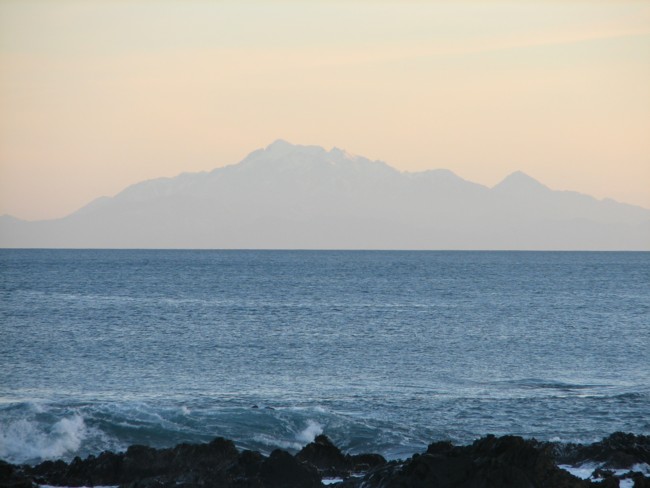 Fishing boats are at anchor in the shelter of Island Bay while seals cling to the rocks in the turbulent currents of Sinclair Head. In the background is the spectacular view of the Kaikoura mountain range over 100Km away across Cook Strait.