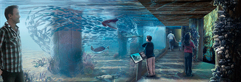 Inside the Centre, your journey to the deep continues at the “Rocky Shore” gallery. A huge variety of plants and animals will live here in large and small, rock pools. There’s even a neat “Touch Gently” pool where you’ll be able to see and learn about marine life up close.